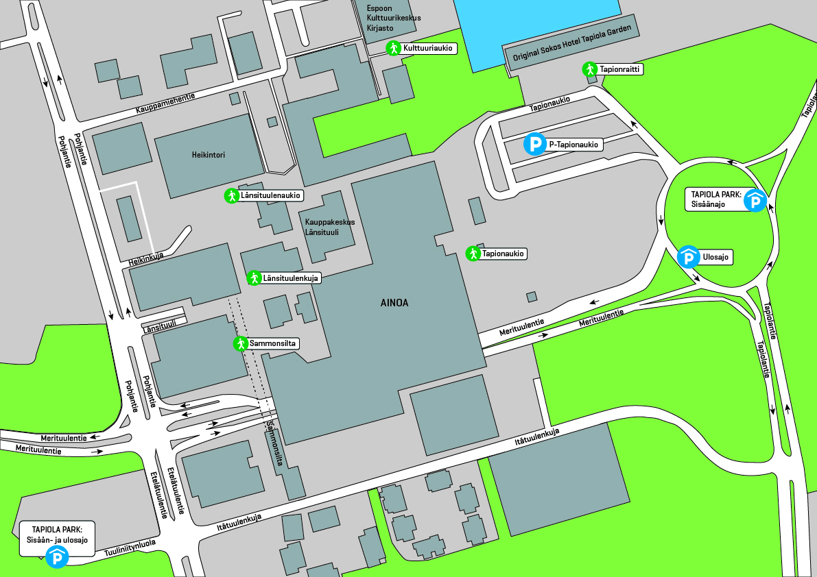 • Entrance from the Tapiolanaukio roundabout to levels P0, P1 and P2. Entrance to P-Liityntäpysäköinti Tapiola Park via level P2.